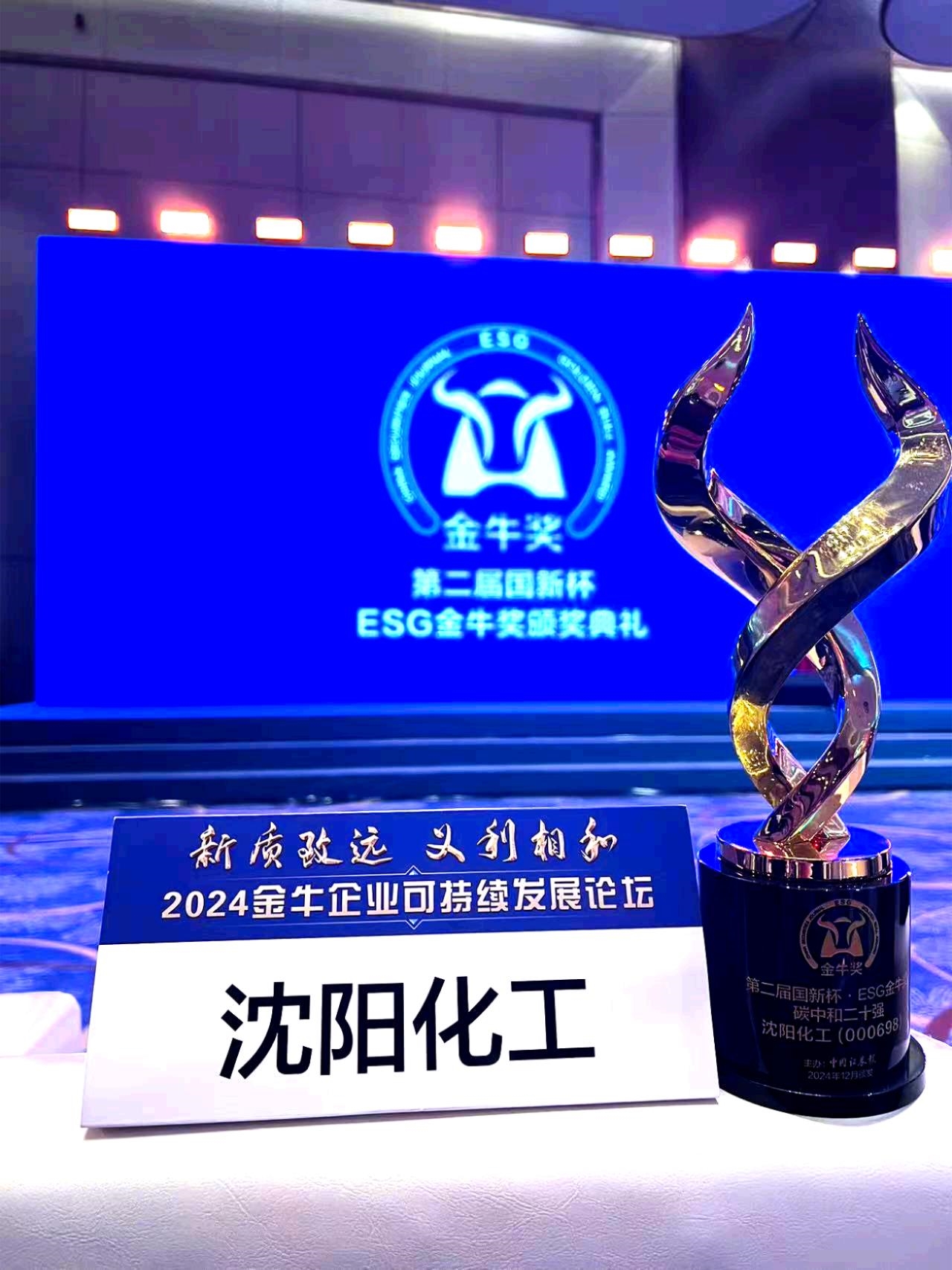 12月6日,由《中國證券報》攜手中國國新控股有限責任公司旗下國新咨詢有限責任公司聯(lián)合舉辦的“新質致遠 義利相和——2024金牛企業(yè)可持續(xù)發(fā)展論壇”暨“第二屆國新杯·ESG金牛獎頒獎典禮”在上海圓滿落幕,沈陽化工股份有限公司(以下簡稱“沈陽化工”)在此次頒獎典禮上榮獲“國新杯·ESG金牛獎碳中和二十強”獎項。這是公司繼去年獲得“第一屆國新杯·ESG金牛獎碳中和五十強”獎項后,再次獲得的ESG殊榮。